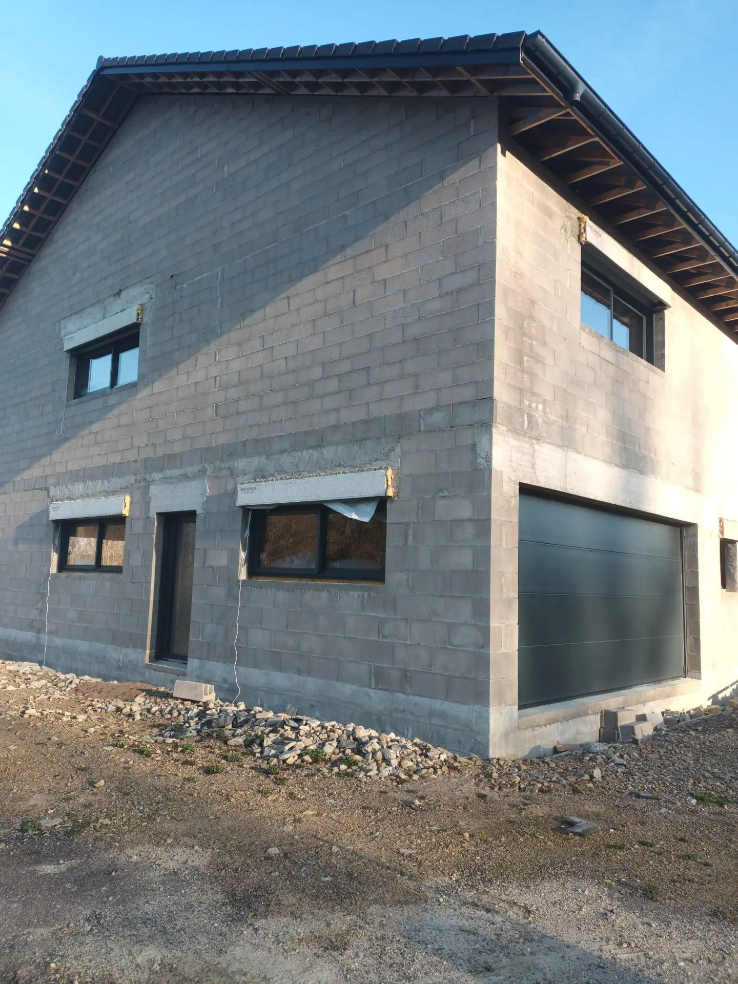 Nous réalisons des maisons sur mesure avec des matériaux solides et durables. Ici, une maison en parpaings avec charpente bois, conçue pour offrir confort et résistance dans le temps.